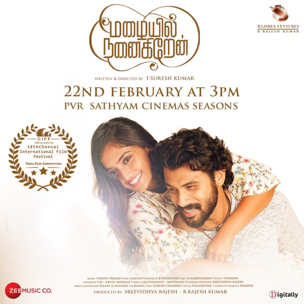 அன்சன் பால், ரெபா ஜான், மேத்யூ வர்கீஸ், அனுபமா குமார், கிஷோர் ராஜ்குமார், சங்கர் குருராஜா, வெற்றிவேல் ராஜா மற்றும் பலர் நடிப்பில் டி.சுரேஷ் குமார் இயக்கதில் விஷ்ணு பிரசாத் இசையில் வெளிவந்து இருக்கும் படம் ‘மழையில் நனைகிறேன்’