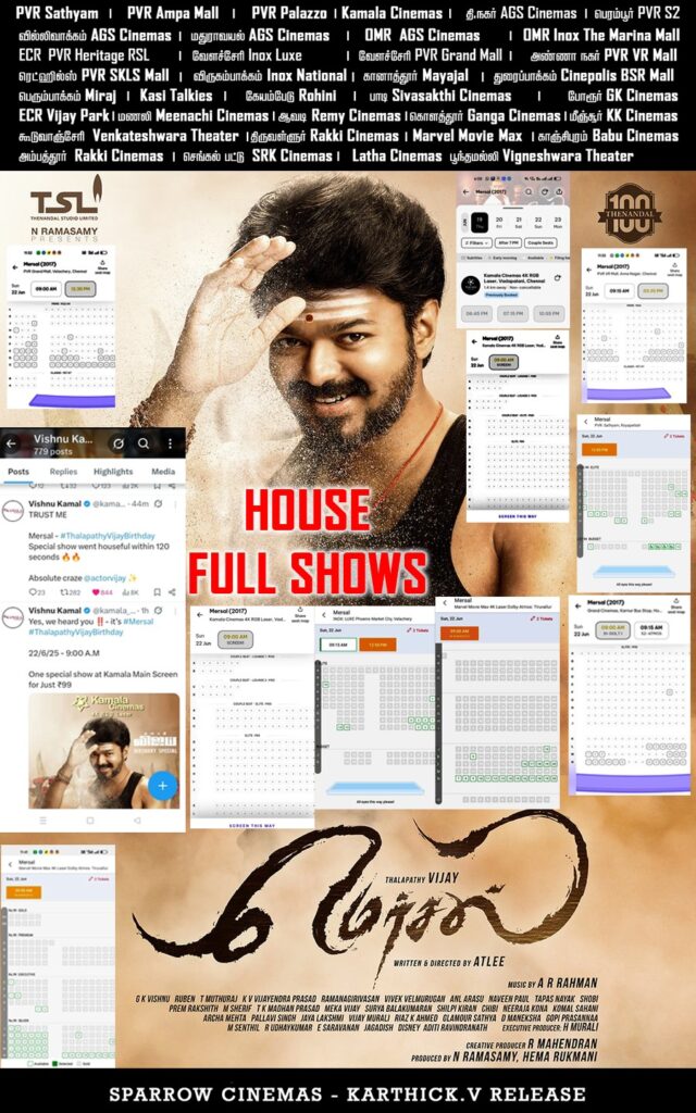 அந்த வகையில் தற்போது விஜய்யின் 51வது பிறந்தநாளை (ஜூன்-22) கொண்டாடும் விதமாக அட்லீ இயக்கத்தில் விஜய் நடிப்பில் 2017ல் வெளியாகி மிகப்பெரிய வெற்றியை பெற்ற மெர்சல் திரைப்படம் இன்று (ஜூன்-20) தமிழகமெங்கும் நூற்றுக்கணக்கான திரையரங்குகளில் (Sparrow Cinemas) ஸ்பேரோ சினிமாஸ் கார்த்திக் வெங்கடேசன் வெளியிட்டுள்ளர்.